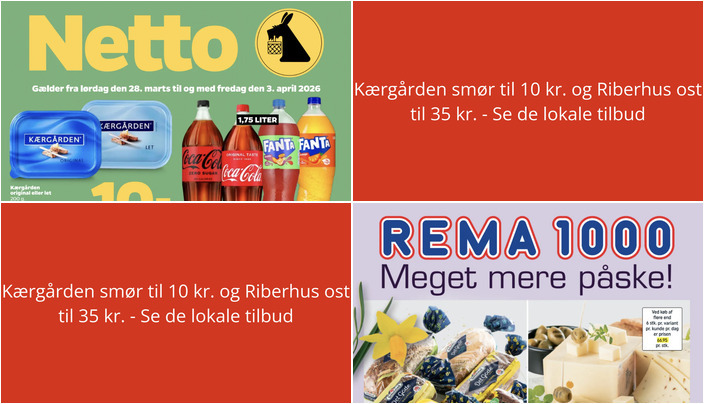 Netto tilbyder Kærgården smør, original eller let, 200 g, til kun 10 kr. pr. stk. Der er dog en begrænsning på max. 3 stk. pr. variant pr. kunde pr. dag. Tilbuddet gælder fra lørdag den 28. marts til fredag den 3. april.