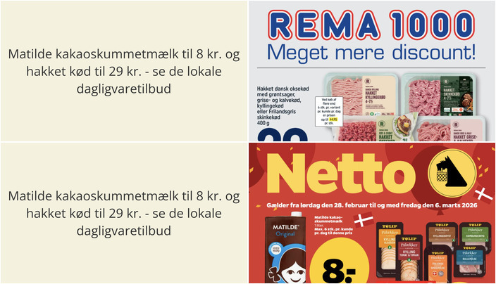 Netto tilbyder Matilde kakaoskummetmælk til en skarp pris på kun 8 kr. pr. liter. Der er dog en begrænsning på 6 stk. pr. kunde pr. dag til denne pris. Tilbuddet gælder fra lørdag den 28. februar til fredag den 6. marts.